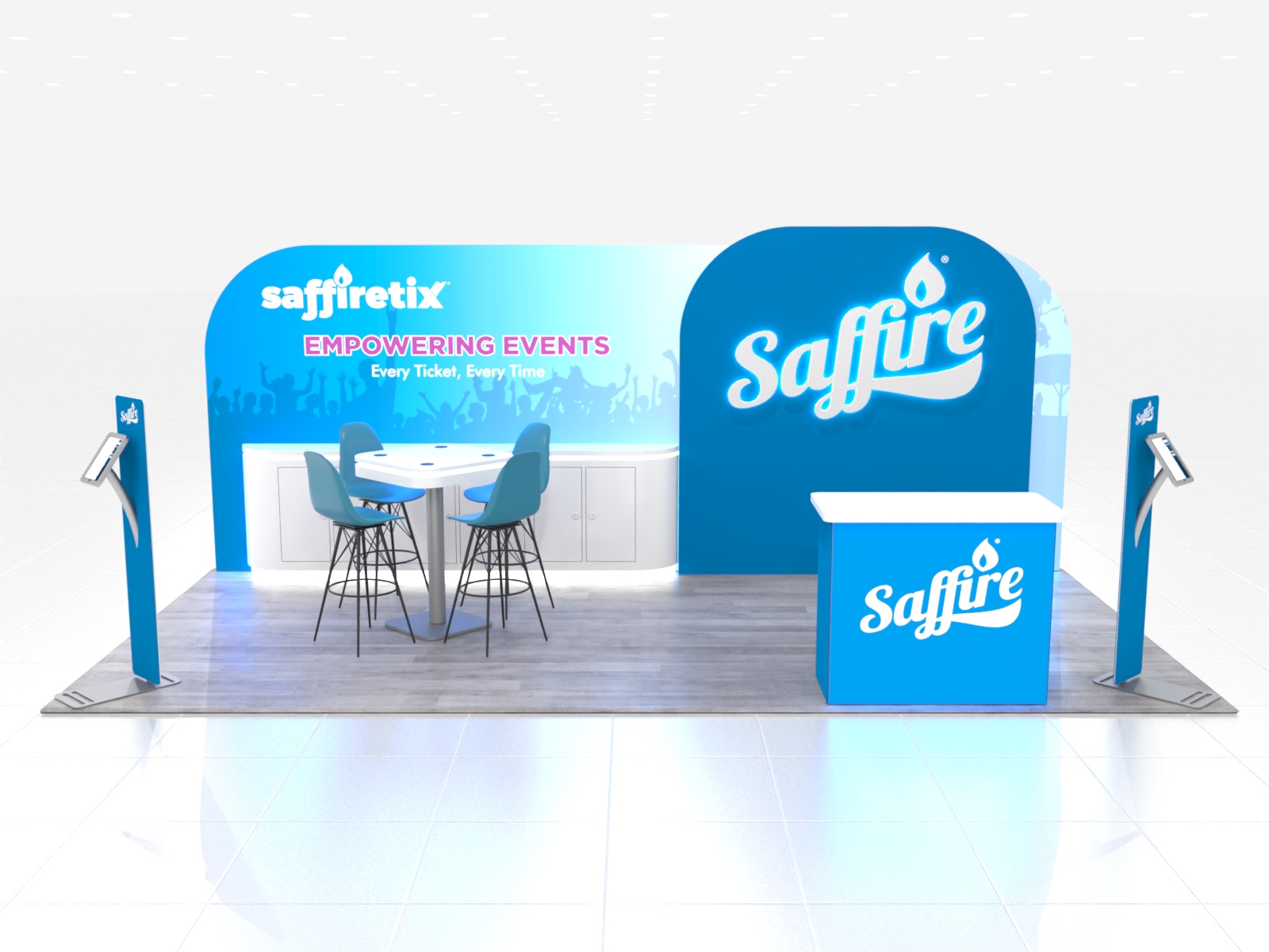 And while the LED lights and backlit graphics provide pizzazz, the reconfigurable inlines are also functional with extensive counters, locking storage, and monitor mounts. There’s even a wireless charging table for meetings and iPad stands for registration, lead retrieval, or product information. Both designs allow for ample space for attendees and booth staff to interact and conduct business.