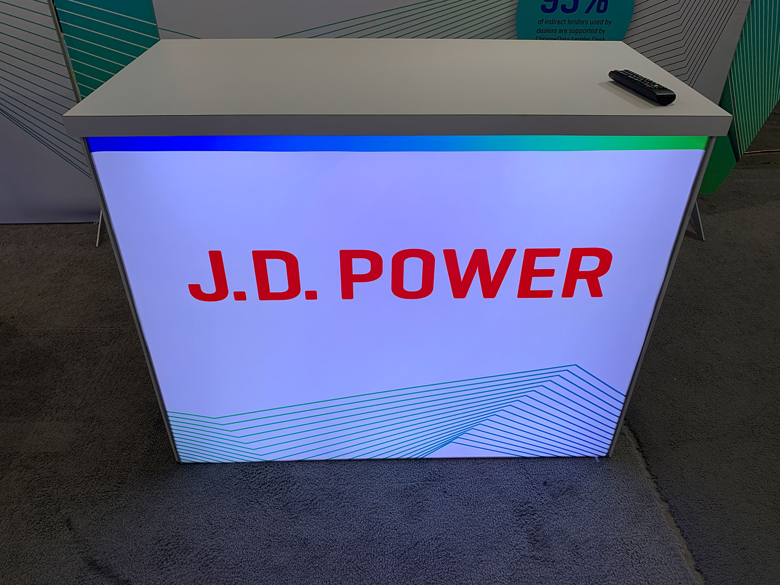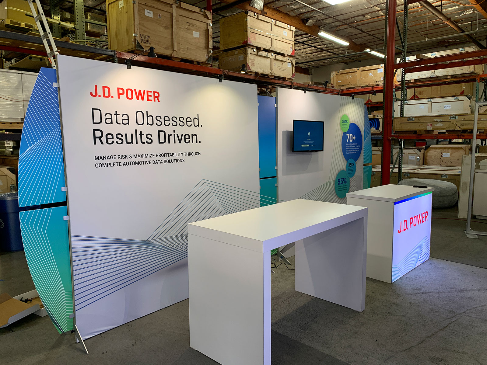 Custom Inline Exhibit with SuperNova Backlit Lightboxes, (4) Product Shelves, Storage Closet, Fabric and Direct Print Graphics, Reception Counter w/ Open Storage, and Counter w/ Locking Storage and Wireless Charging Pads [ORD-69079]