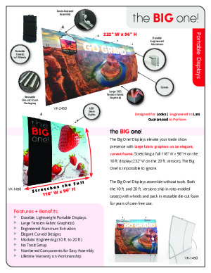 VK-1450 The Big One Portable Trade Show Display -- Image 1 The Big One's impressive bold looks will WOW folks on the trade show floor with its curved 8 ft. high fabric graphic(s). After the show, you’ll be gone in a flash because the Big One! packs small, disassembles fast, and ships in portable case(s) with wheels. The durable aluminum frame sets-up in less than 30 minutes for a 10 x 10 using quick-assist knobs and SEG graphics. It’s that easy to maximize your presence on the trade show floor.